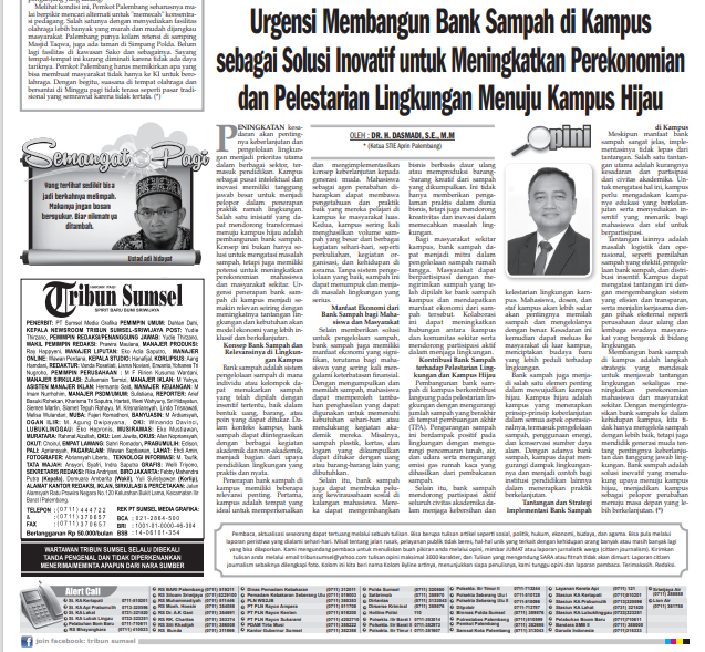 Ketua Sekolah Tinggi Ilmu Ekonomi APRIN Rilis Opini Di TRIBUN SUMSELdengan Judul : “ Urgensi Membangun Bank Sampah di Kampus sebagai Solusi Inovatif untuk Meningkatkan Perekonomian dan Pelestarian Lingkungan Menuju Kampus Hijau”