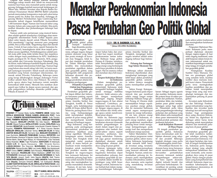Ketua Sekolah Tinggi Ilmu Ekonomi APRIN Rilis Opini Di TRIBUN SUMSELdengan Judul : “ Menakar Perekonomian Indonesia Pasca Perubahan Geo PolitikGlobal”