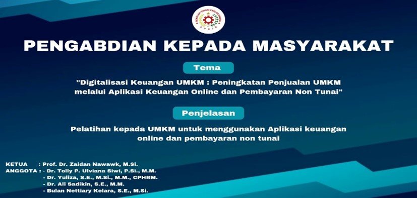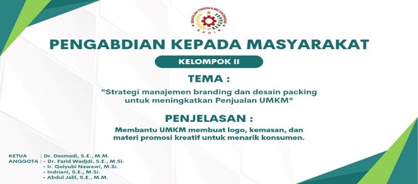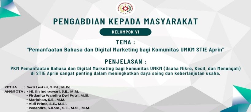 Pengabdian masyarakat ini diketuai oleh Kepala LPPM STIE APRIN Tedy Setiawan Saputra, SE., MM, CRMPA , dan dilaksanakan oleh tujuh tim dosen STIE APRIN yang secara langsung turun tangan untuk membantu para pelaku UMKM dalam meningkatkan kapasitas dan daya saing usaha mereka. Setiap tim memiliki tema yang berbeda sesuai dengan kebutuhan masing-masing UMKM yang didampingi.