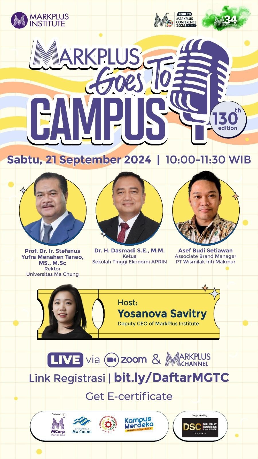 Ikuti The 130th MarkPlus Goes to Campus “Entrepreneurial Marketing”. MarkPlus Goes to Campus (MGTC) merupakan ajang bertemunya komunitas kampus di Indonesia, ajang saling sharing inspirasi, serta sudut pandang Creativity, Innovation, Entrepreneurship, dan Leadership yang telah atau akan dilaksanakan oleh Lembaga Pendidikan tinggi di Indonesia.