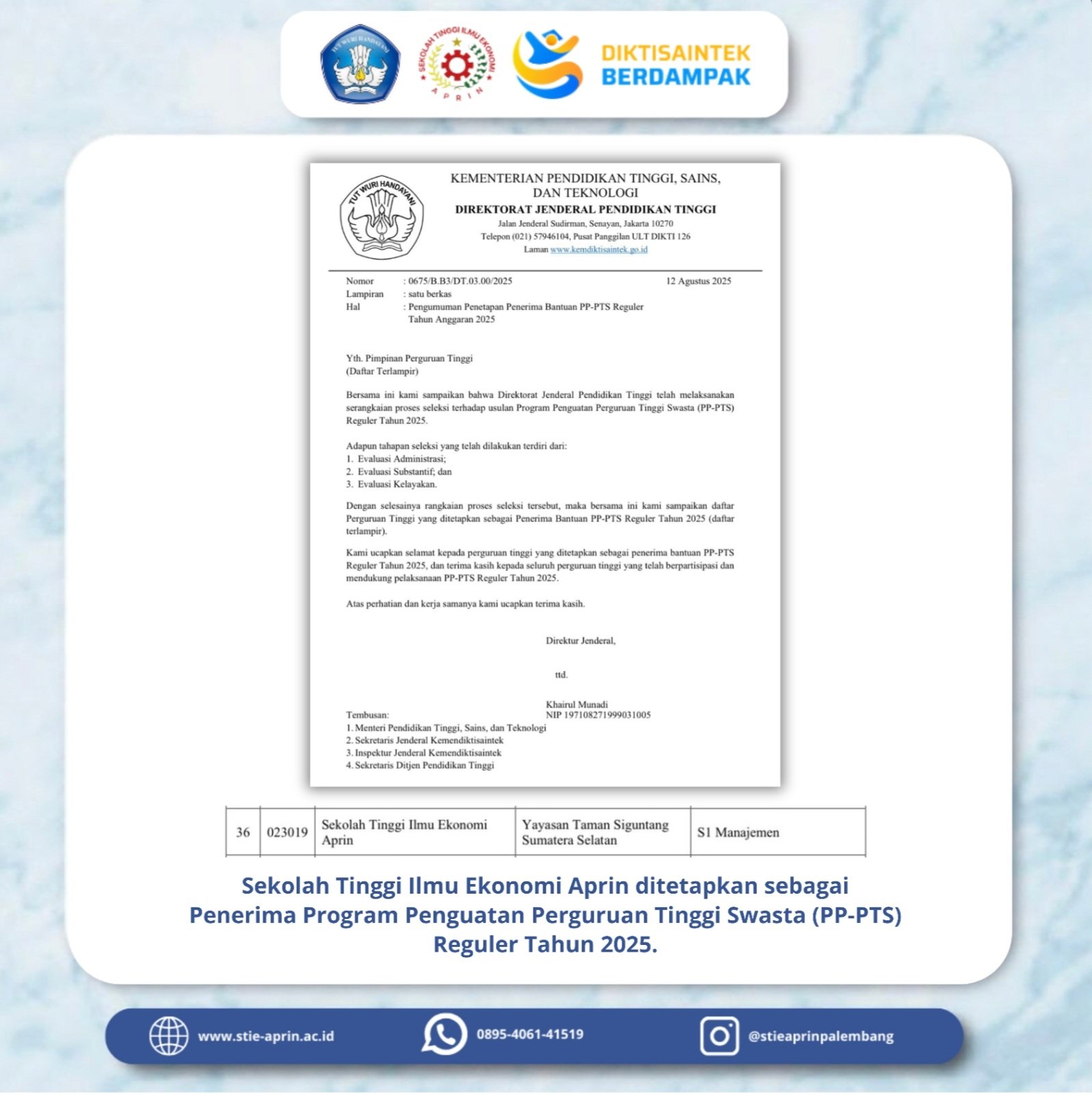 Sekolah Tinggi Ilmu Ekonomi APRIN ditetapkan sebagai salah satu penerima Program Penguatan Perguruan Tinggi Swasta (PP-PTS) Reguler Tahun 2025.