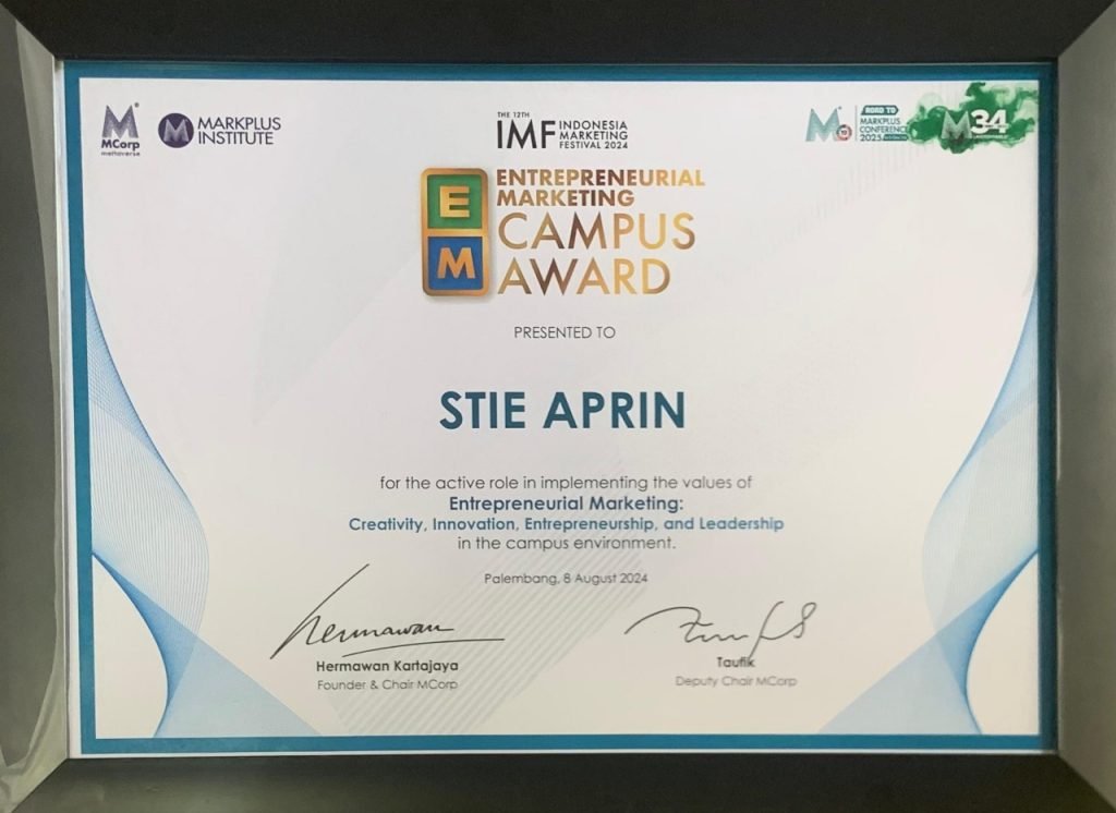 Sekolah Tinggi Ilmu Ekonomi Aprin telah meraih penghargaan bergengsi “Campus Entrepreneurial Marketing Award SUMSEL 2024” dalam acara The 12th Indonesia Marketing Festival 2024 yang diselenggarakan oleh MarkPlus Institute. Prestasi ini menunjukkan komitmen dan dedikasi kampus dalam menciptakan dan mengembangkan budaya kewirausahaan serta pemasaran di kalangan mahasiswa dan seluruh civitas akademika.