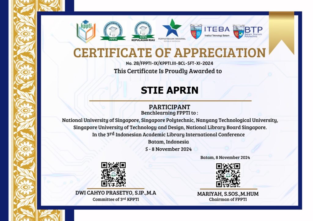 Ketua Sekolah Tinggi Ilmu Ekonomi (STIE) APRIN, Dr. H. Dasmadi, S.E., M.M., turut berpartisipasi dalam acara bergengsi Konferensi Internasional Perpustakaan Perguruan Tinggi Indonesia (KPPTI) bertajuk “The 3rd Indonesian Academic Library International Conference: Policies, Libraries & Artificial Intelligence — Managing Digital Technology to Enhance Higher Education Quality.”