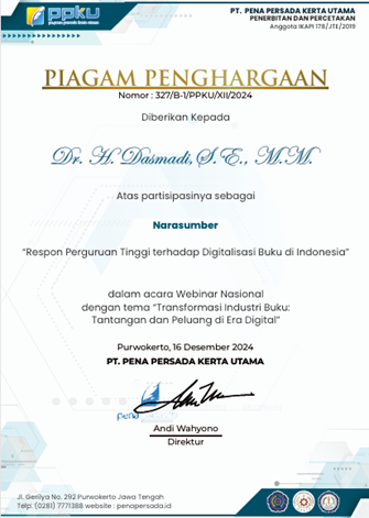Ketua STIE APRIN Dr. H. Dasmadi, SE, MM, kembali menunjukkan kiprahnya dalam dunia akademik dan literasi dengan menjadi narasumber utama pada kegiatan Webinar dan Call for Book Chapter II yang diselenggarakan oleh Penerbit Pena Persada. Acara ini mengusung tema “Transformasi Industri Buku: Tantangan dan Peluang di Era Digital” dan berlangsung pada akhir tahun 2024.
