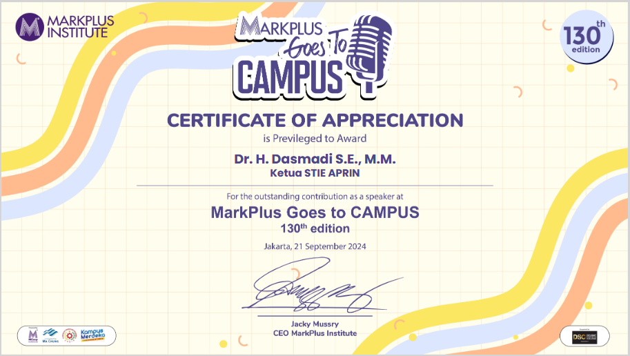 Ketua STIE APRIN/Bapak Dr. H. Dasmadi, S.E. M.M , Menjadi Narasumber MarkPlus Goes to Campus “Entrepreneurial Marketing”. MarkPlus Goes to Campus (MGTC) merupakan ajang bertemunya komunitas kampus di Indonesia, ajang saling sharing inspirasi, serta sudut pandang Creativity, Innovation, Entrepreneurship, dan Leadership.