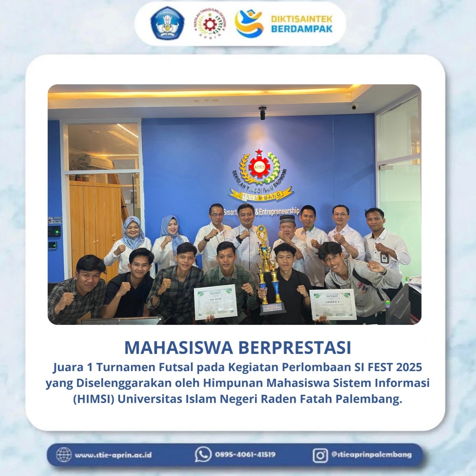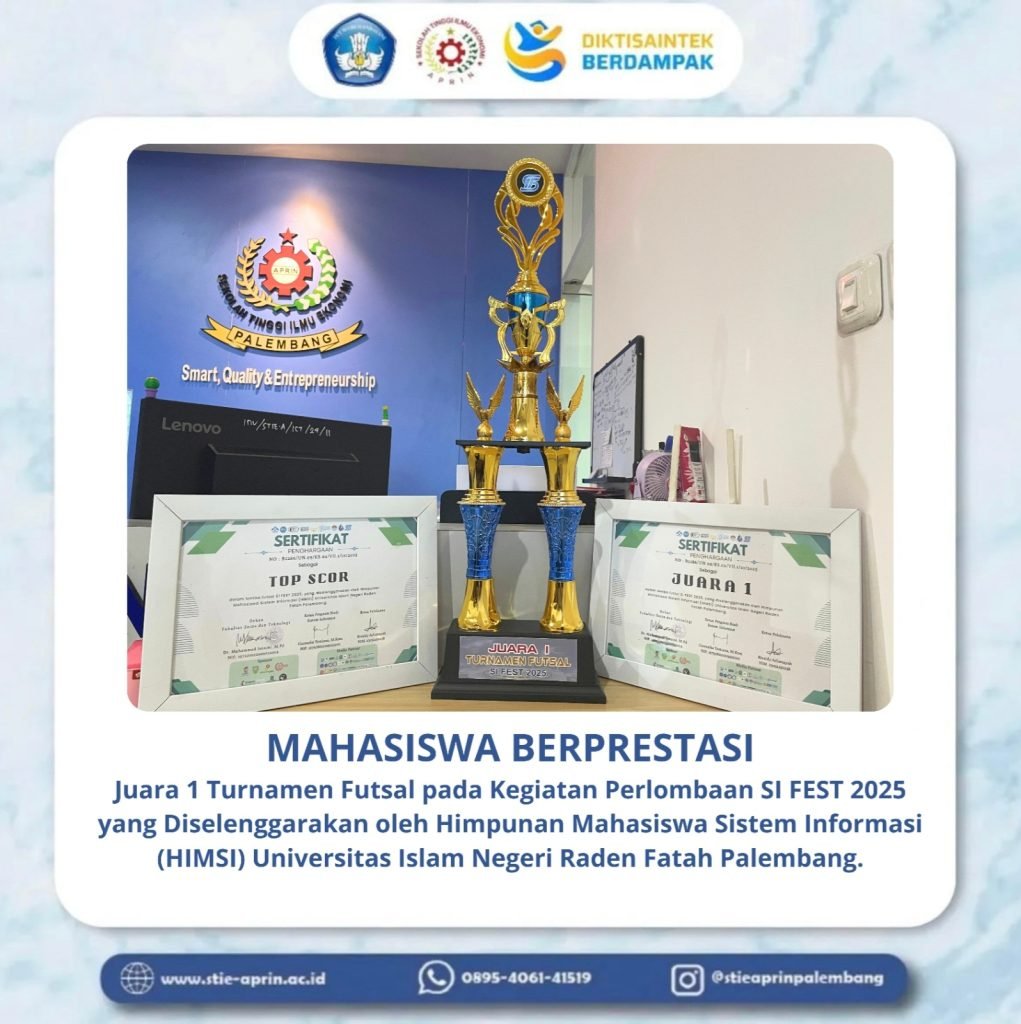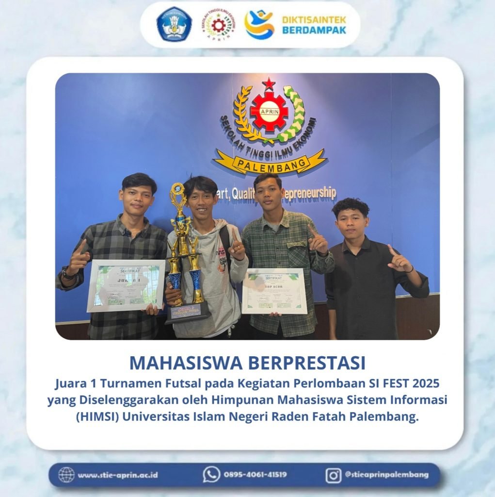 Selamat kepada Mahasiswa Sekolah Tinggi Ilmu Ekonomi “APRIN” Palembang atas prestasinya meraih Juara 1 Turnamen Futsal pada kegiatan Perlombaan SI FEST 2025 yang diselenggarakan oleh Himpunan Mahasiswa Sistem Informasi (HIMSI) Universitas Islam Negeri Raden Fatah Palembang.