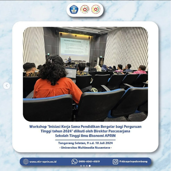 Pada tanggal 09 hingga 10 Juli 2024, Dr. Yuliza, S.E., M.Si., selaku Direktur Pascasarjana STIE APRIN Palembang, bersama peserta dari berbagai universitas di Indonesia, mengikuti kegiatan Workshop bertema “Inisiasi Kerja Sama Pendidikan Bergelar bagi Perguruan Tinggi Tahun 2024.” Kegiatan ini diselenggarakan di Universitas Multimedia Nusantara, Tangerang Selatan, dan berlangsung selama dua hari penuh.