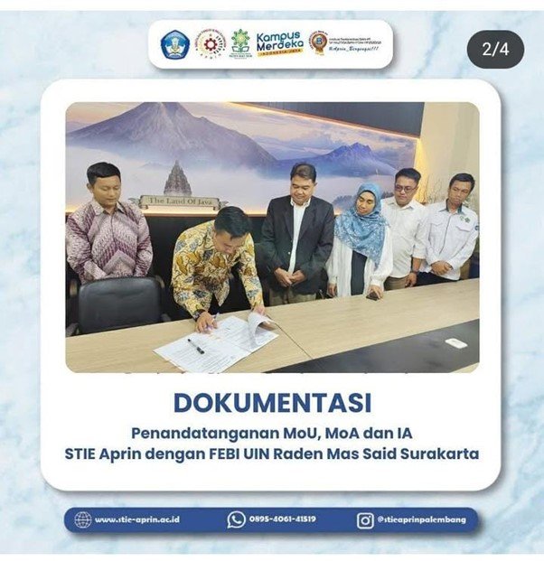 Pada tanggal 21 April 2025, Sekolah Tinggi Ilmu Ekonomi (STIE) APRIN yang dipimpin oleh Dr. H. Dasmadi, S.E., M.M. selaku Ketua, bersama jajaran pimpinan, telah melaksanakan penandatanganan dokumen kerja sama berupa Memorandum of Understanding (MoU), Memorandum of Agreement (MoA), dan Implementation Agreement (IA) dengan Fakultas Ekonomi dan Bisnis Islam (FEBI) UIN Raden Mas Said Surakarta.